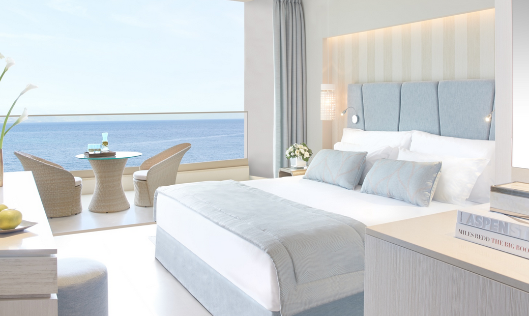 Elegantna, prostorna soba, ki združuje sodoben slog s čudovitim razgledom, kjer se lahko družine udobno sprostijo. Mehke kreme in pastelno modri odtenki odsevajo jonsko nebo, uživajte v razgledu iz svojega zasebnega prostora.